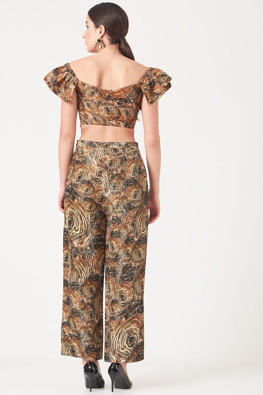 Brown And Gold Blackhole Print Crop Top And Pants Coord Set