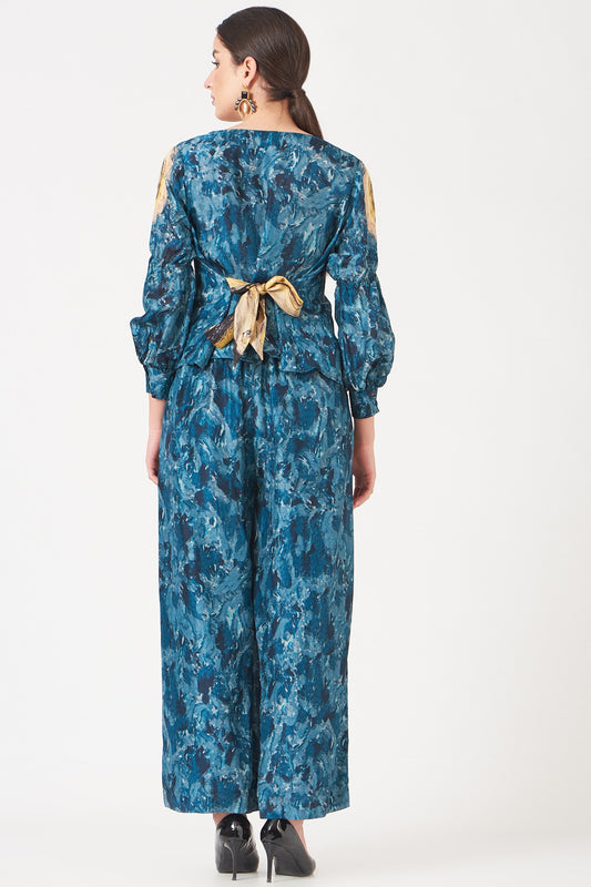 Pale Yellow And Blue Tunnel Print Waist Tie Up Top And Pants Coord Set