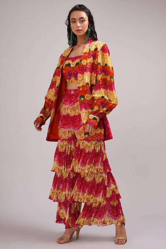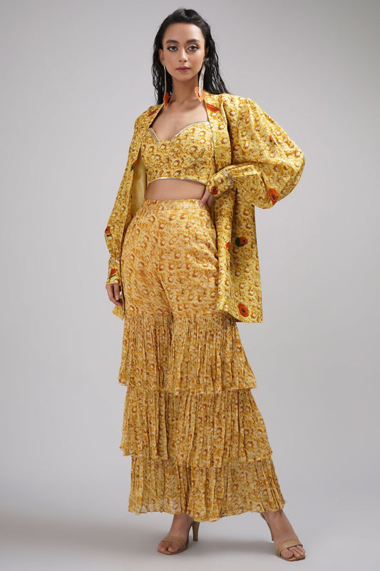 Sweetheart Neck Bustier Blouse Light Sharara Set Paired With A Stylised Jacket.