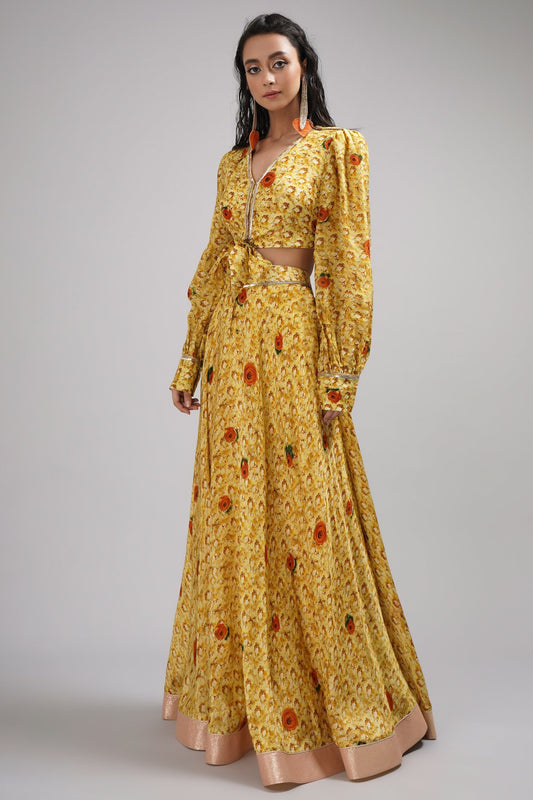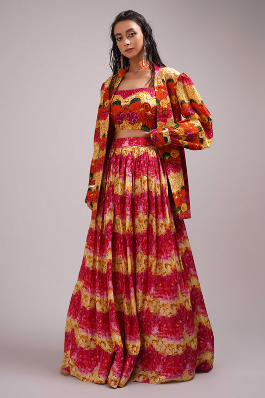 Scoop Neck Bustier Blouse Light Lehanga Set Paired With A Stylised Jacket.