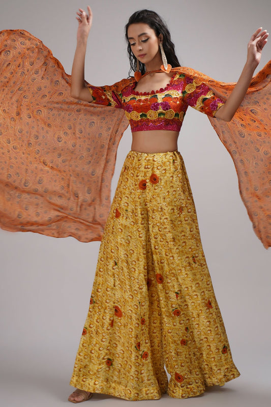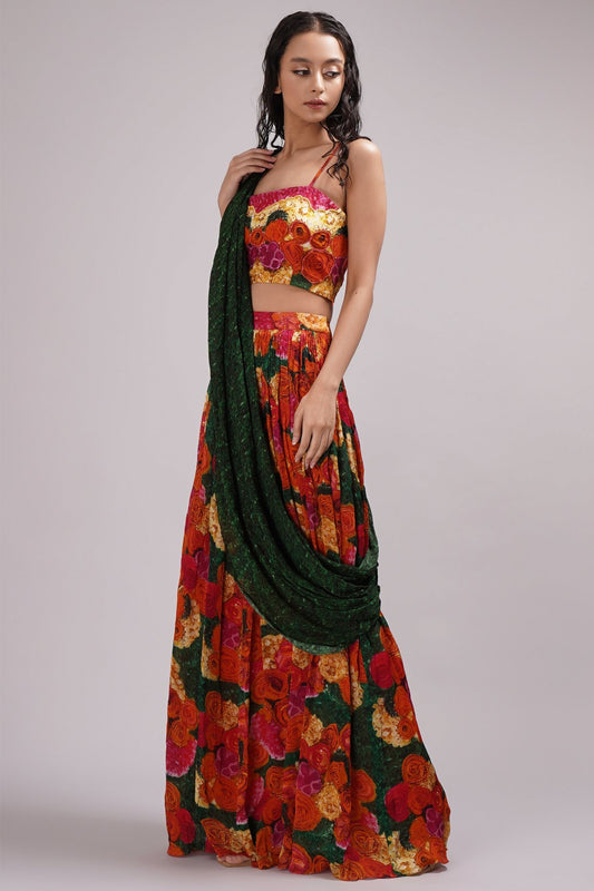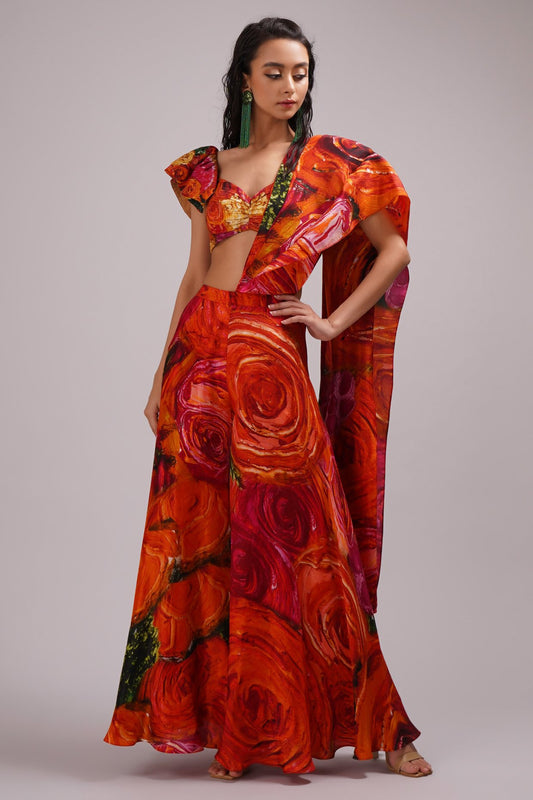 Fusion Style Boat Neck Blouse Pant Cowl Saree Set