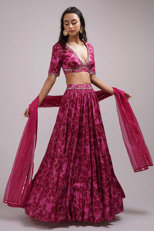 Purple Pink Deep Neck Blouse And Lehenga Set
