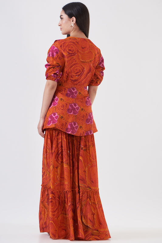 Orange & Pink Upada Silk Hand Painted Sharara Set