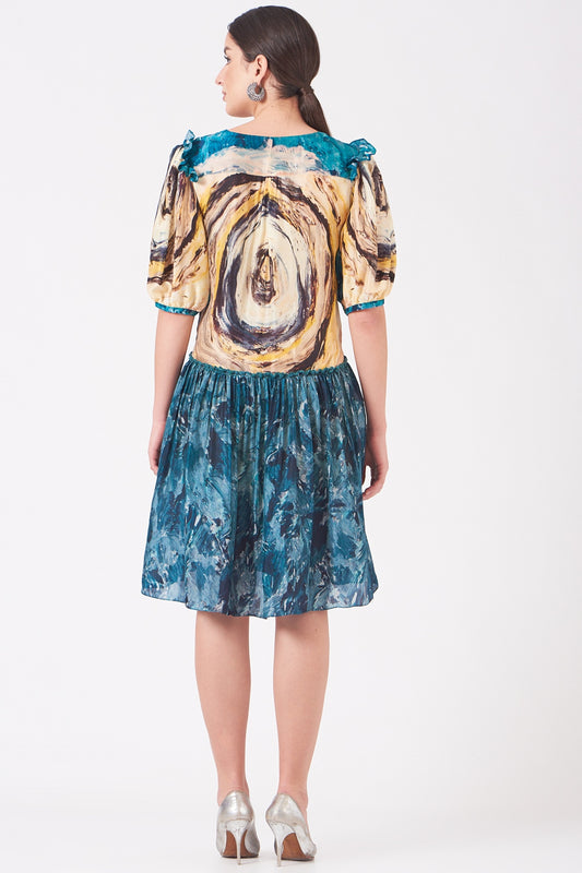 Yellow And Deep Blue Maya Print A-Line Overlap Ruffle Dress