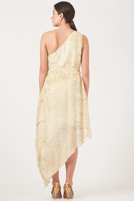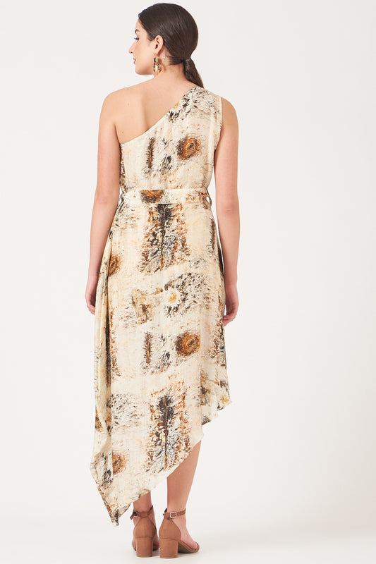 Beige And Gold Divine Print Short One Shoulder Dress