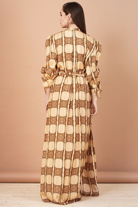 Gold & Brown Printed Gown With Stole