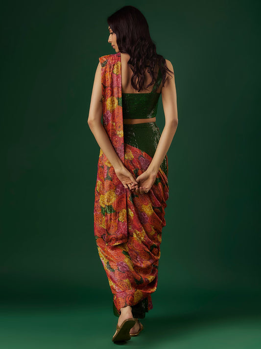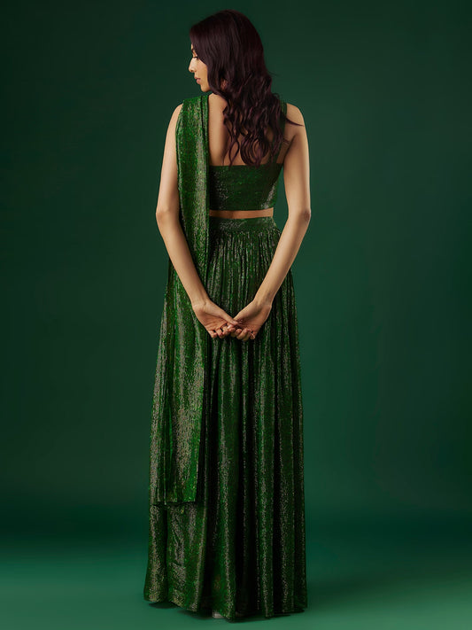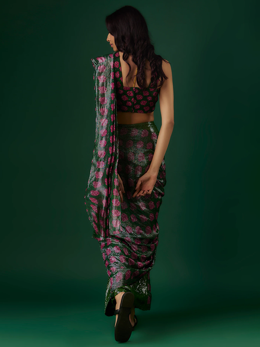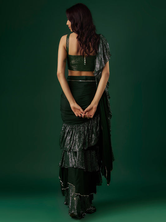 Deep Green Chinon & Shimmer Georgette Sequin Ruffled Saree Set