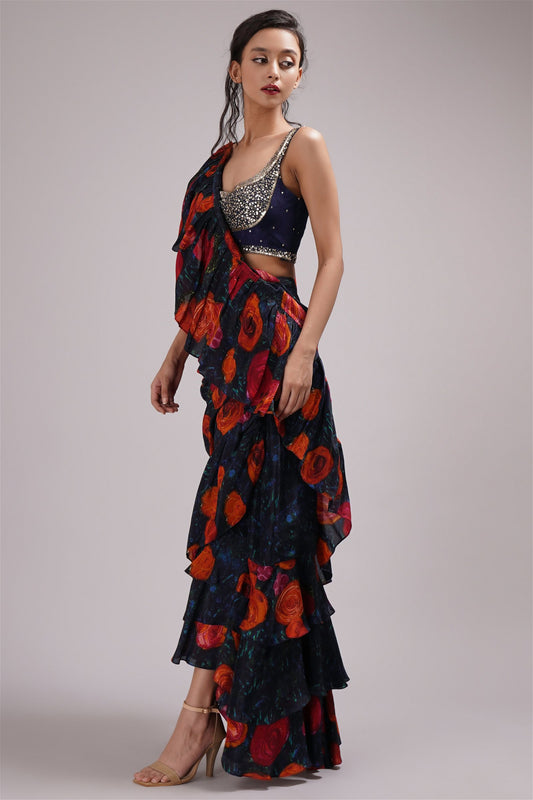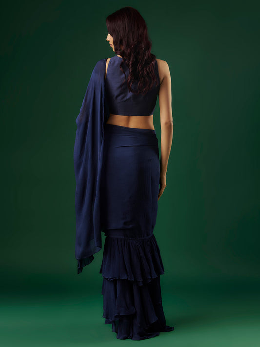Navy Blue Chinon Ruffled Saree Set