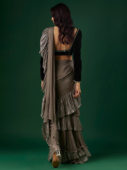 Grey Chinon & Shimmer Georgette Ruffled Saree Set