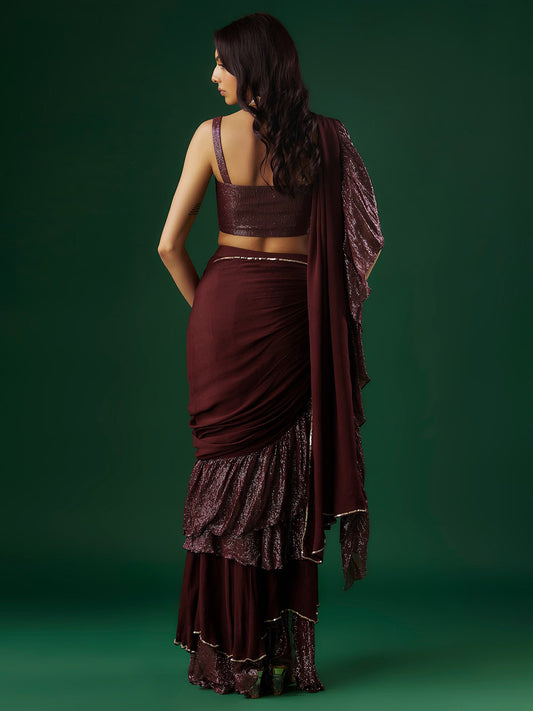 Deep Wine Shimmer Georgette Sequin Ruffled Saree Set