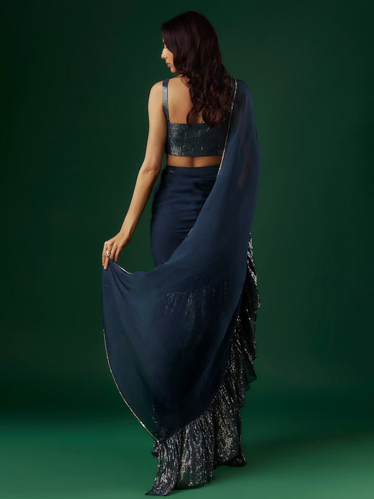 Deep Navy Blue Shimmer Georgette Sequin Ruffled Saree Set