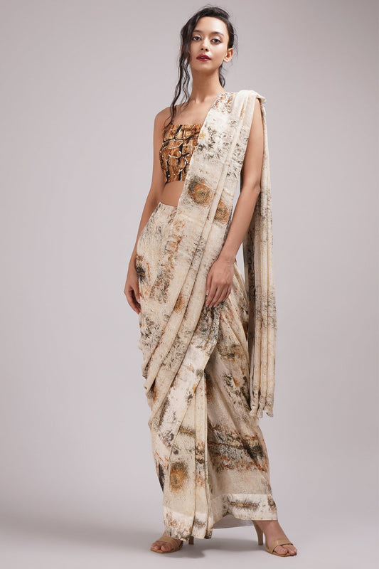 Multi-Colored Shimmer Georgette Handpainted Pre-Draped Saree Set