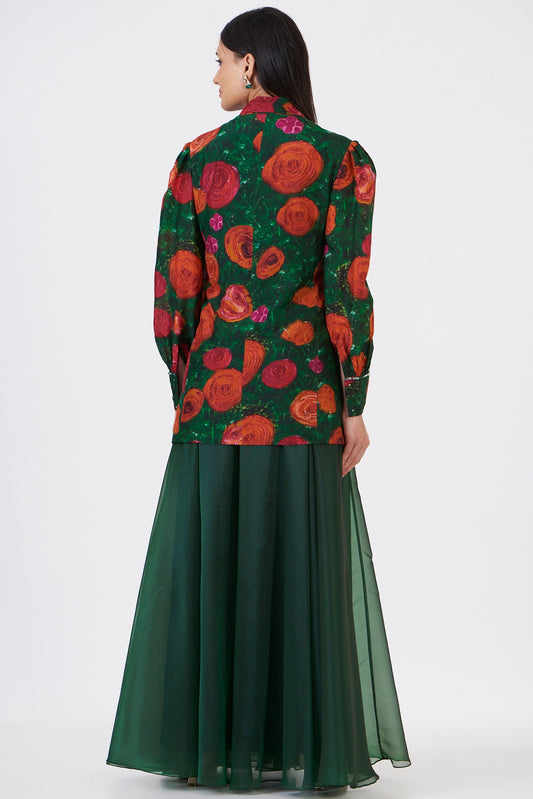 Rusty Green Embroidered Jacket With Crop Top & Palazzo Pants