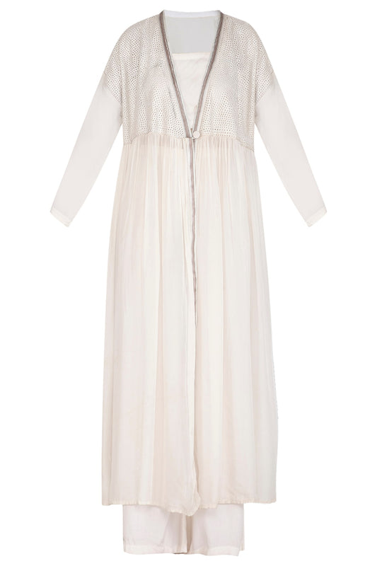 White Embroidered Shrug Jacket With Crop Top & Palazzo Pants