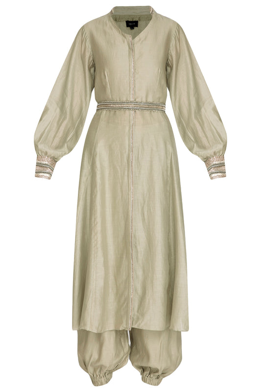 Sage Green Embroidered Jacket With Crop Top, Jumper Pants & Belt