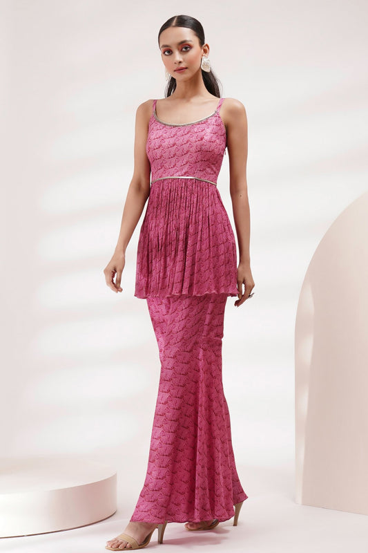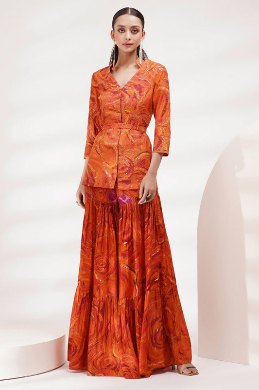 Scoop Neck Bustier Blouse Light Sharara Set Paired With A Stylised Jacket.