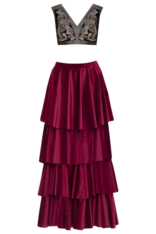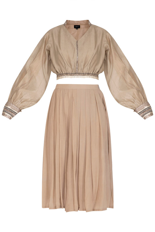 Beige Hand Embroidered Crop Top With Pleated Skirt