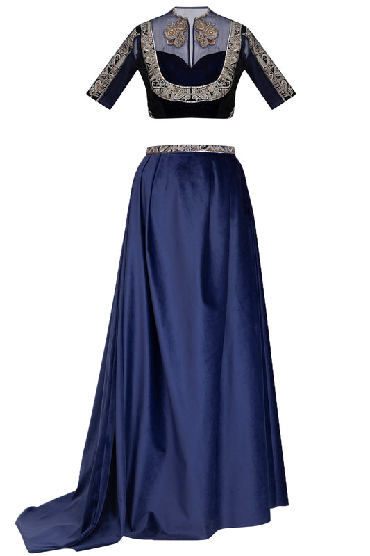 Navy Blue Embroidered Blouse With Draped Skirt & Belt