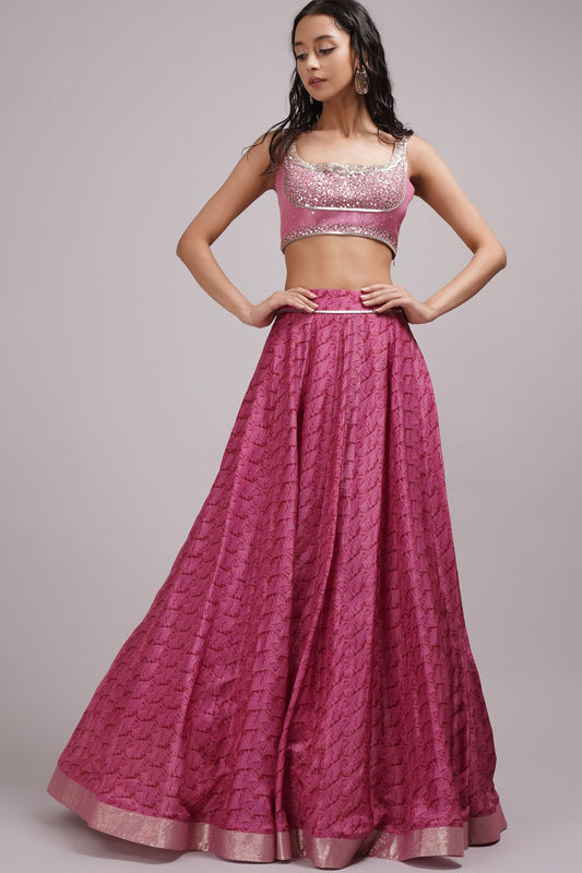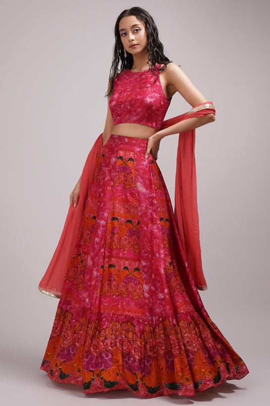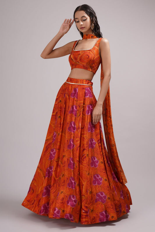 Featuring An Orange Anarkali In Raw Silk Base With Hammered Dabka And Metal Zardosi Embroidery. It Is Paired With Contrasting Fuchsia Palazzo Pants In Chanderi Brocade Base And Chinon Dupatta.