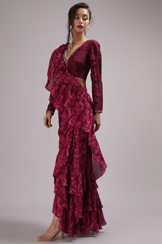 V Neck Full Sleeve Blouse Ruffled Saree Set
